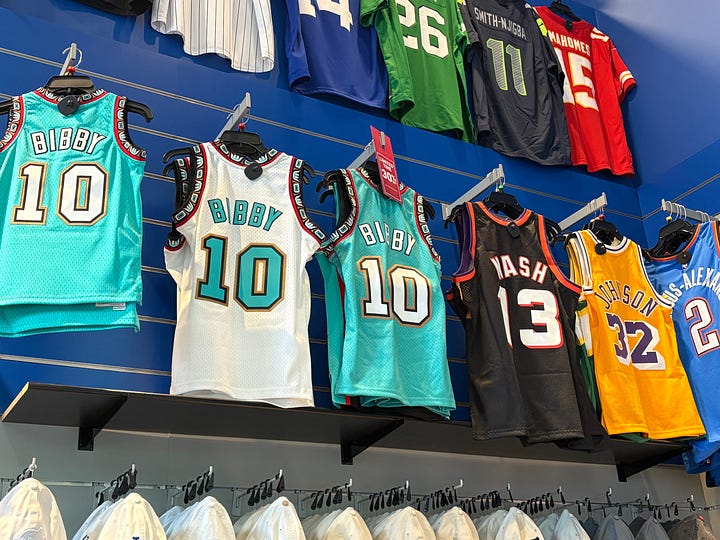 The nearest store to my hotel selling NBA gear had a fairly predictable rack of jerseys on offer in its prime display ... filled with old Mike Bibby Grizzlies jerseys and featuring Canada's two MVPs. The graphic next to it is our DLLS Sports promo card for the trip. ICYMI: Sharing one-on-one interviews I conducted on the trip with Rookie of the Year favorite Cooper Flagg and Mavericks coach Jason Kidd: